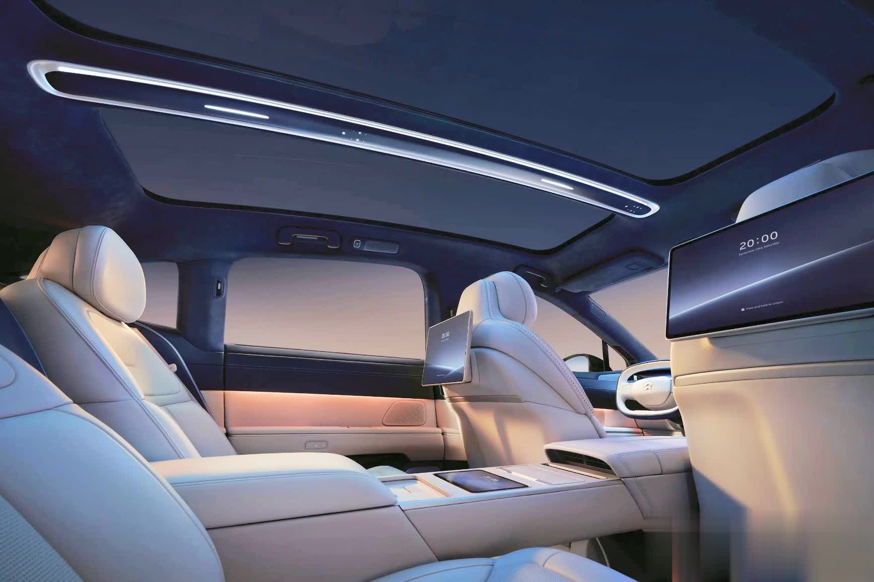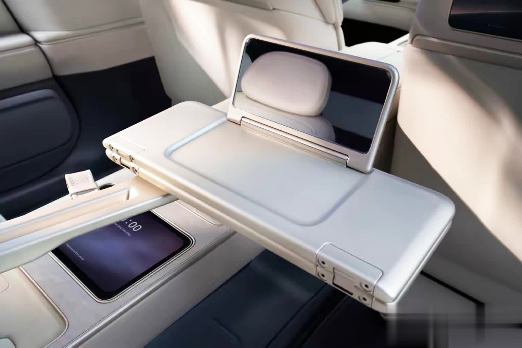 来到后排,中间“行政桥”集成了多种功能模块,二排的360°无级调节行政桌案,支持阅读办公、会议对谈等多种场景下的随意调节角度,14.5英寸后排行政屏的角度也会随座椅位置智能调节,确保乘客在任何姿态下都有最佳视角。同时座椅支持一键舒躺,16点式按摩,加上宽敞的空间表现及256色漫反射环形灯,舒适感、豪华感全部到位了。
